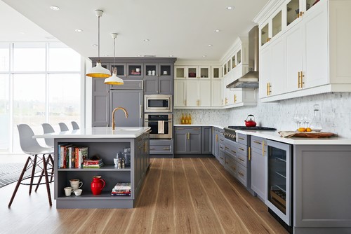 Two-toned cabinets are quickly overtaking the white-on-white look that has dominated kitchen design for the past few years. While white remains a classic, grey and bleached-wood cabinet variations are surging in popularity, along with darker neutrals like navy and green.